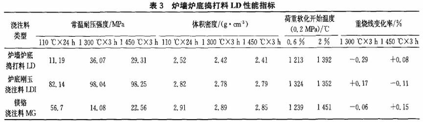 爐墻出現(xiàn)變形,中間縮窄,底部變寬,容易出現(xiàn)開裂:爐底出現(xiàn)大量的氧化鐵渣堆積,影響生產。其所用澆注料、搗打料的性能如下表: