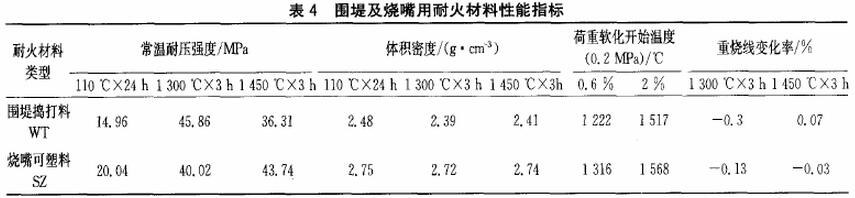 圍堤粘渣嚴重,阻礙了立柱的行程,圍堤也出現(xiàn)開裂,清渣時容易出現(xiàn)破損。其所用搗打料的性能如下表。變形量0.6%時圍堤搗打料的荷重軟化溫度為1222℃變形量2%時僅為1517℃,變形溫度的范圍比較寬,開始變形的溫度低,從1222℃變形量達到0.6%,搗打料容易發(fā)軟,粘渣就比較嚴重。燒嘴周圍搗打料形態(tài)穩(wěn)定,粘渣少,表明所用爐襯材料性較好,爐墻有內陷、開裂情況,與搗打料的性能有關。圍堤及燒嘴所用可塑料的性能如表4.從表4看出,變形量0.6%時,燒嘴可塑料的荷重軟化溫度為1316℃,而變形量達到2%時僅為1568℃,這個溫度區(qū)間比較大,荷重軟化溫度提高,對于減少粘渣有利。