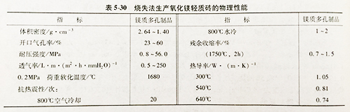 燒失法生產(chǎn)氧化鎂輕質(zhì)磚是以工業(yè)氧化鎂為原料,在1700℃下煅燒的熟料經(jīng)粉碎機除鐵處理后制成粉料。添加石油焦作為可燃加入物。物料中加入1%的亞硫酸紙漿廢液、水分為3%-4%,在30MPa的壓力下成型,干燥后在1700~1720℃燒成,保溫2h,其制品的性能見下表: