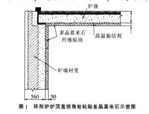 (3)在施工部位刷上一層高溫黏結(jié)劑(約7~10kg/m2),同時(shí)在多晶莫來(lái)石貼塊表面抹一層高溫黏結(jié)劑(約2kg/m2),將貼面塊保持10%~15%的壓縮量,粘貼于環(huán)形爐爐墻和爐頂工作面。