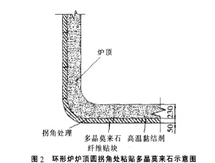 (8)爐頂圓拐角處粘貼多晶莫來(lái)石纖維貼塊,應(yīng)將貼塊按圓角處的形狀現(xiàn)場(chǎng)彎曲成原爐襯圓角形狀,確保貼塊的粘貼強(qiáng)度和此處的密閉、保溫效果,如圖2所示。