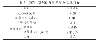 (9)粘貼多晶莫來(lái)石貼塊的高溫黏結(jié)劑型號(hào)為OSM-C1300,其性能見(jiàn)表2所示。