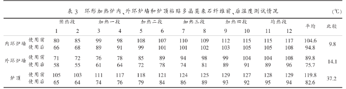 增加輻射傳熱,減少熱損失,降低燃料消耗多晶莫來(lái)石纖維的黑度為0.95,環(huán)形加熱爐內(nèi)襯粘貼多晶莫來(lái)石纖維后,爐內(nèi)熱輻射明顯增強(qiáng),提高了爐子的加熱能力和管坯的加熱速度,尤其是環(huán)形爐加熱Φ220及以上大管坯時(shí)效果更為明顯。為了檢驗(yàn)、對(duì)比使用效果,施工前、后(在同一生產(chǎn)條件下)分別在環(huán)形爐6個(gè)生產(chǎn)工藝段的內(nèi)、外環(huán)爐墻鋼板以及爐頂上各選定2個(gè)測(cè)溫點(diǎn)用紅外測(cè)溫儀進(jìn)行測(cè)溫,將測(cè)試溫度記錄并進(jìn)行比較,見(jiàn)表3。