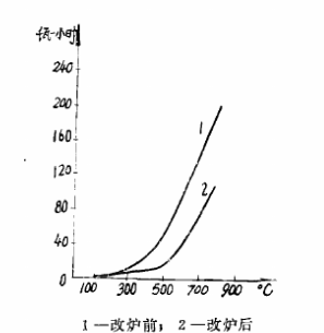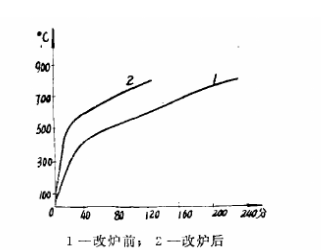 RJ冬45一9改裝前后空載升溫試驗(yàn)曲線見(jiàn)圖1所示,升溫階段耗電量與溫度關(guān)系曲線見(jiàn)圖2所示。由圖可見(jiàn),當(dāng)爐溫由130℃升至800℃時(shí),加熱時(shí)間從215分縮短到108分;耗電量由147度下降到90度。