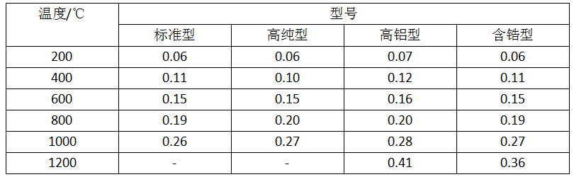 根據(jù)其工藝的不同,陶瓷纖維毯可分為甩絲毯和噴吹毯兩大類,兩種類型的陶瓷纖維毯性能見表1。不同溫度下陶瓷纖維毯的導熱系數(shù)見表2。
