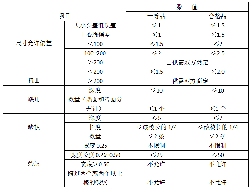 水泥窯用磷酸鹽高鋁磚的理化性能、尺寸允許偏差及外觀見(jiàn)表1、見(jiàn)表2。