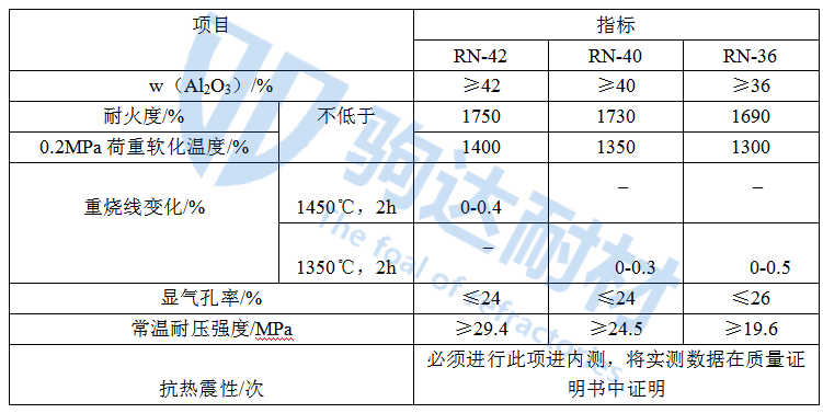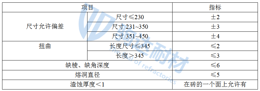 YB/T5107-1993將熱風(fēng)爐用黏土質(zhì)耐火磚按理化指標(biāo)分為RN-42、RN-40、RN-36三種牌號。其理化指標(biāo)、尺寸允許偏差及外觀見表1和表2。