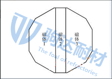 隨著近年來電熔窯逐漸向大熔化面積(熔化面積大于20m2)發(fā)展方向,對于吊碹的設(shè)計也提出了新的挑戰(zhàn)。吊碹面積加大意味著重量增加,為了保證吊碹的可重復利用因此獨創(chuàng)了分體吊碹結(jié)構(gòu),圖1為國內(nèi)某廠家設(shè)計的21m2電熔窯吊碹拆分示意圖,將碹體分為3部分,每部分獨立承重在裝卸時可單獨拆分吊裝。