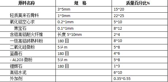 通過選用具有多孔結構的輕質莫來石骨料、氧化鋁空心球和導熱系數(shù)較小的含鋯高鋁耐火纖維, 達到提高爐輥保溫性能, 減少冷卻水帶走的熱損失, 同時降低體積密度, 減少爐輥的重量與轉動的動力消耗的目的;通過0.1~1 mm的焦寶石的加入, 彌補了小于1 mm輕質骨料性能劣化的不足, 并通過焦寶石優(yōu)良的熱震穩(wěn)定性與高溫性能, 提高了澆注料的綜合使用性能;通過使用水泥、二氧化硅和-Al2O3微粉作為復合結合劑, 引入水合結合和凝聚結合兩種凝結硬化機理, 提高材料的低、中和高溫強度;通過加入少量鋰輝石粉的燒結促進作用, 改善澆注料使用條件下的燒結狀況, 促進爐輥澆注料隔熱襯使用條件下高溫陶瓷結合相的形成, 提高隔熱襯的抗破損能力;通過添加含鋯高鋁耐火纖維, 利用其在基體中的拉拔作用所產生的增強、增韌效應, 提高爐輥澆注料抗機械振動能力和抗沖擊韌性;通過添加藍晶石粉作為膨脹劑, 利用藍晶石高溫下不可逆分解為莫來石和游離的Si O2而產生體積膨脹, 抵消澆注料高溫下體積收縮, 防止?jié)沧⒘吓c金屬輥身之間熱膨脹不匹配造成的澆注料層開裂和脫落;通過減水劑、有機消泡劑和硅烷偶聯(lián)劑等外加劑的使用, 提高了澆注料的施工流動性, 降低了澆注料的加水量, 改善了爐輥澆注隔熱襯施工質量與綜合性能。