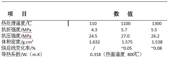 按優(yōu)化配方稱料, 混合均勻后加水攪拌、澆注成型為40mm×40 mm×160 mm試樣, 常溫自然養(yǎng)護24小時, 脫模后于110℃烘干24 h, 部分試樣繼續(xù)在1100和1300℃熱處理3 h, 然后按相關標準檢測不同溫度處理后試樣的體積密度、抗折和抗壓強度、導熱系數(shù)等物理性能, 具體數(shù)據(jù)如表2所示。相對常規(guī)爐輥重質澆注料 (體積密度2.2g·cm-3, 導熱系數(shù)0.738 W· (m·K) -1) 而言, 體積密度降低25.8%, 具有更輕的容重, 導熱系數(shù)降低約57%, 具有更加優(yōu)良的隔熱效果。同時, 研制的輕質隔熱澆注料具有較高的低、中、高溫強度, 隨著溫度的升高, 澆注料的力學性能比較穩(wěn)定, 沒有發(fā)生大的波動?梢娡ㄟ^配方中多種外加劑的合理設計, 大幅提高了輕質澆注料的抗折、抗壓強度和抗機械振動能力, 澆注料常溫抗壓強度達到24.5 MPa, 遠高于普通輕質澆注料的力學性能, 不僅滿足了脫模及搬運要求, 還完全滿足了爐輥300℃烘烤完畢直接入爐使用的要求, 經各溫度處理后線變化率較小, 表明有較好的體積穩(wěn)定性。