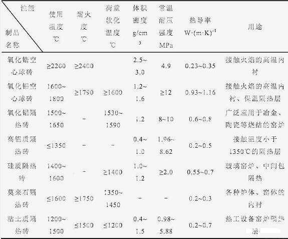 表1 常見(jiàn)高溫隔熱磚性能與用